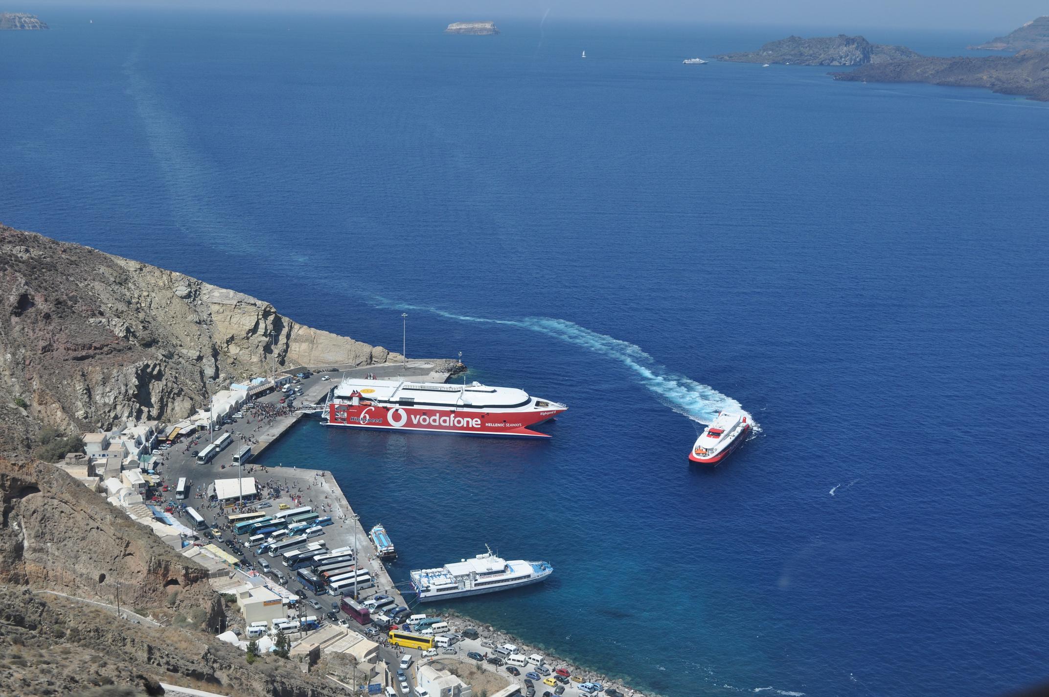 На другой день наш путь лежит на остров Санторини -фото начинается с парома (остров Святой Ирины, географическое название -Тира), это удивительно по своей красоте место! Изначально остров был круглый, но в результате землетрясения, большая часть ушла под воду и осталась кальдера в форме полумесяца