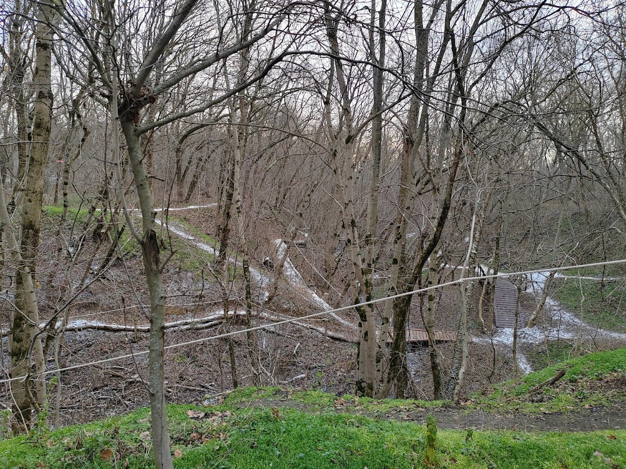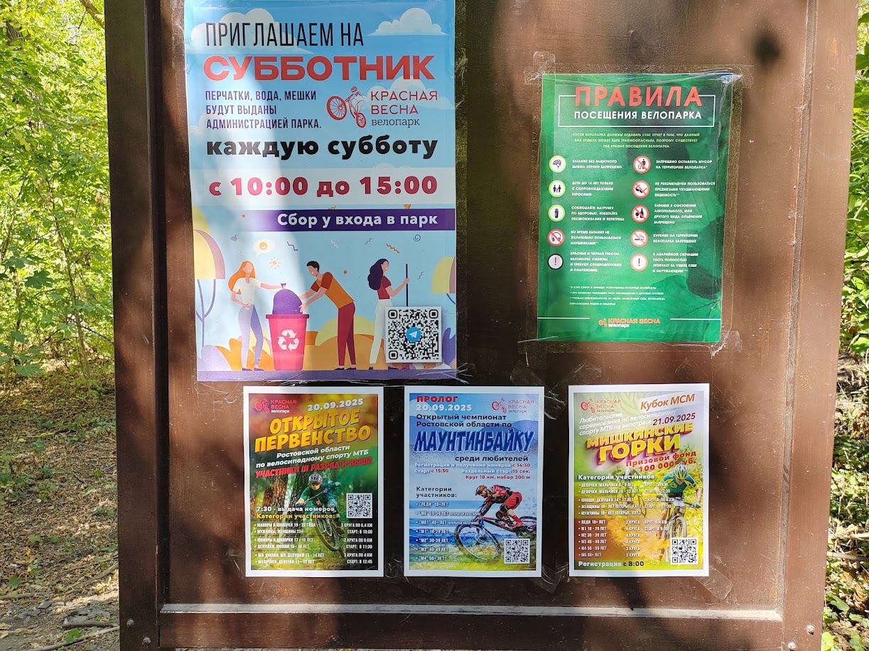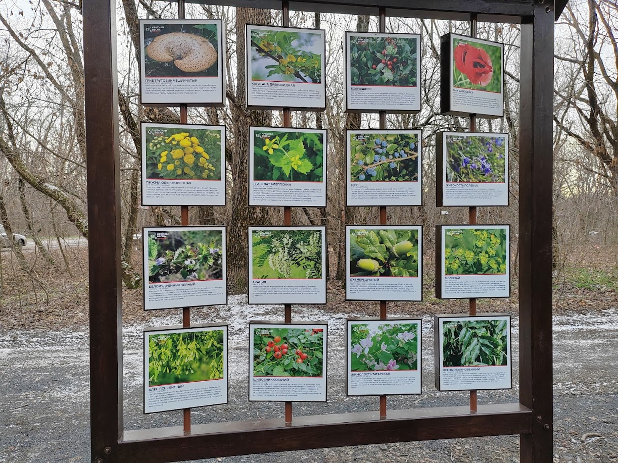 У входа на велотропу с дороги на туббольницу поставили стенд с информацией о флоре рощи и её окрестностей. Много картинок с описаниями растений. Но забыли самую многочисленную обитательницу - амброзию полыннолистную, а ещё - полынь, коноплю, лебеду, бирючину, физалис, и дерево - каркас южный.