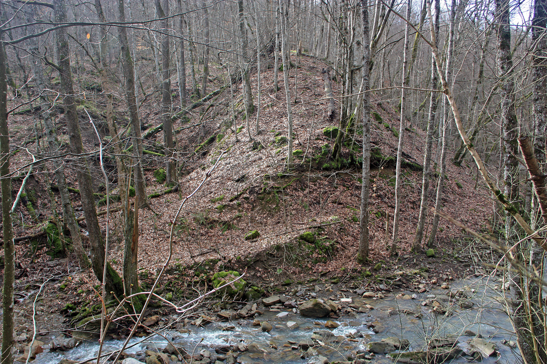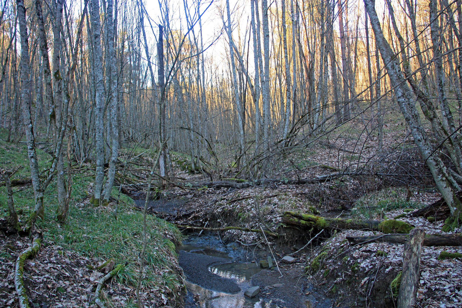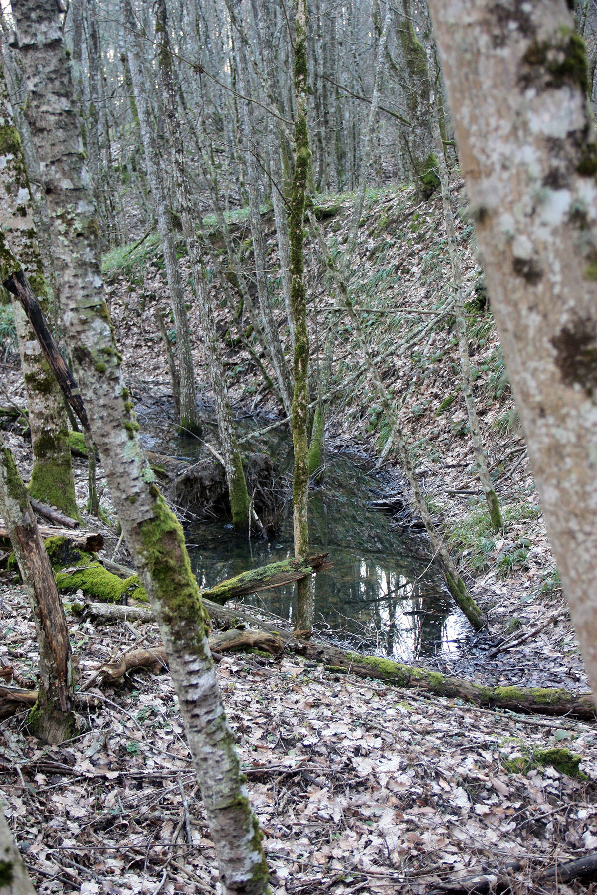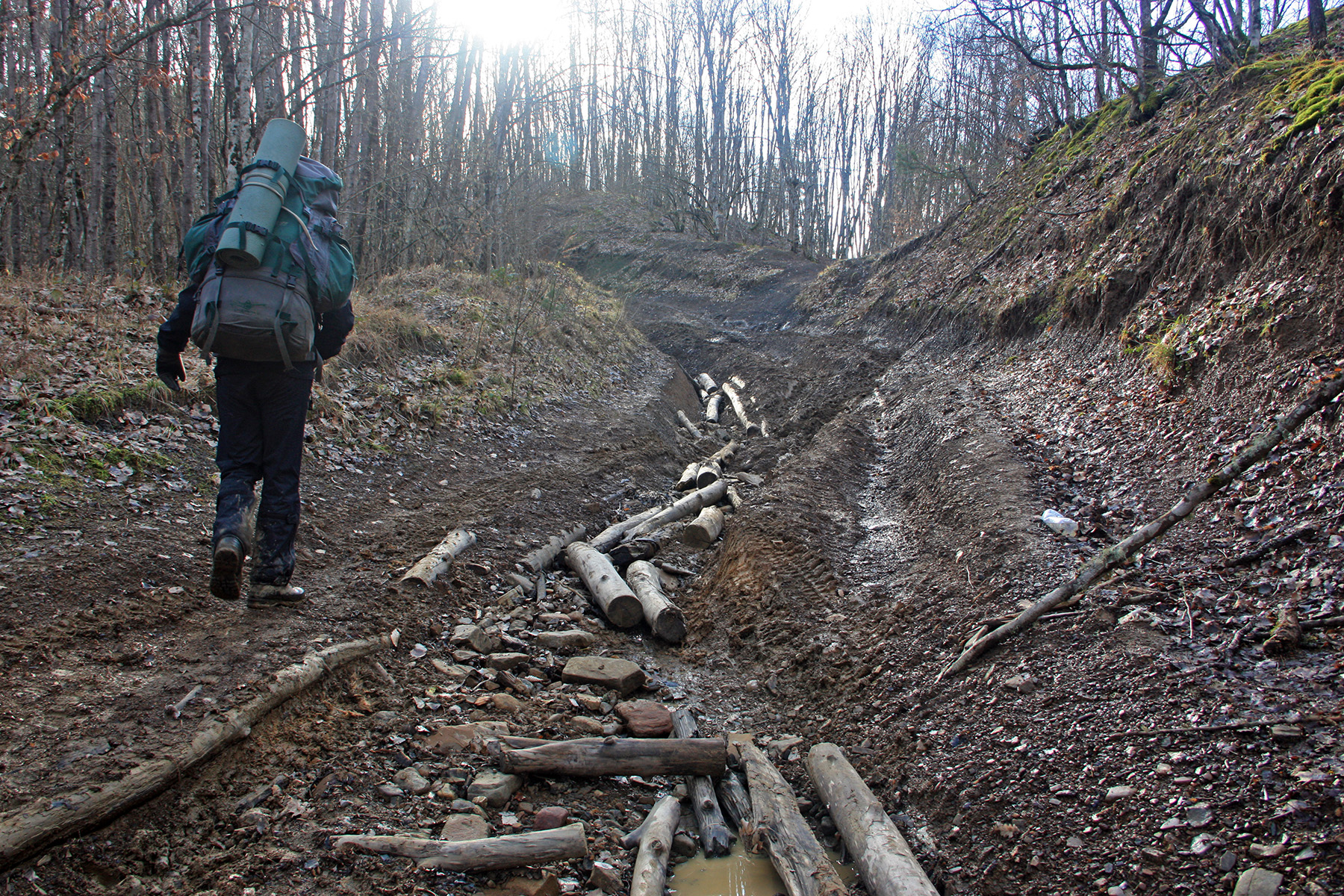 К 16-35 спускаемся по лесистым склонам к ручью. Здесь не один ручей, здесь место, где сходятся несколько русел-оврагов. Некоторые пустые, один-основной, к нему есть притоки. Всё сходится к большому водопропускнику, в виде бетонной трубы, под насыпную дамбу старого волока. Дамба уходит на запад, вверх, на склон. Дальше, по карте, до мест, пригодных под стоянку-далеко. А время-через час начнёт темнеть. Мы пошли в феврале! Ищем пригодное место под стоянку. Нашли, терраска небольшая, но травянистая. Есть место под палатку, удобное место под костёр. Много дров вокруг. Вода рядом, в ручье.