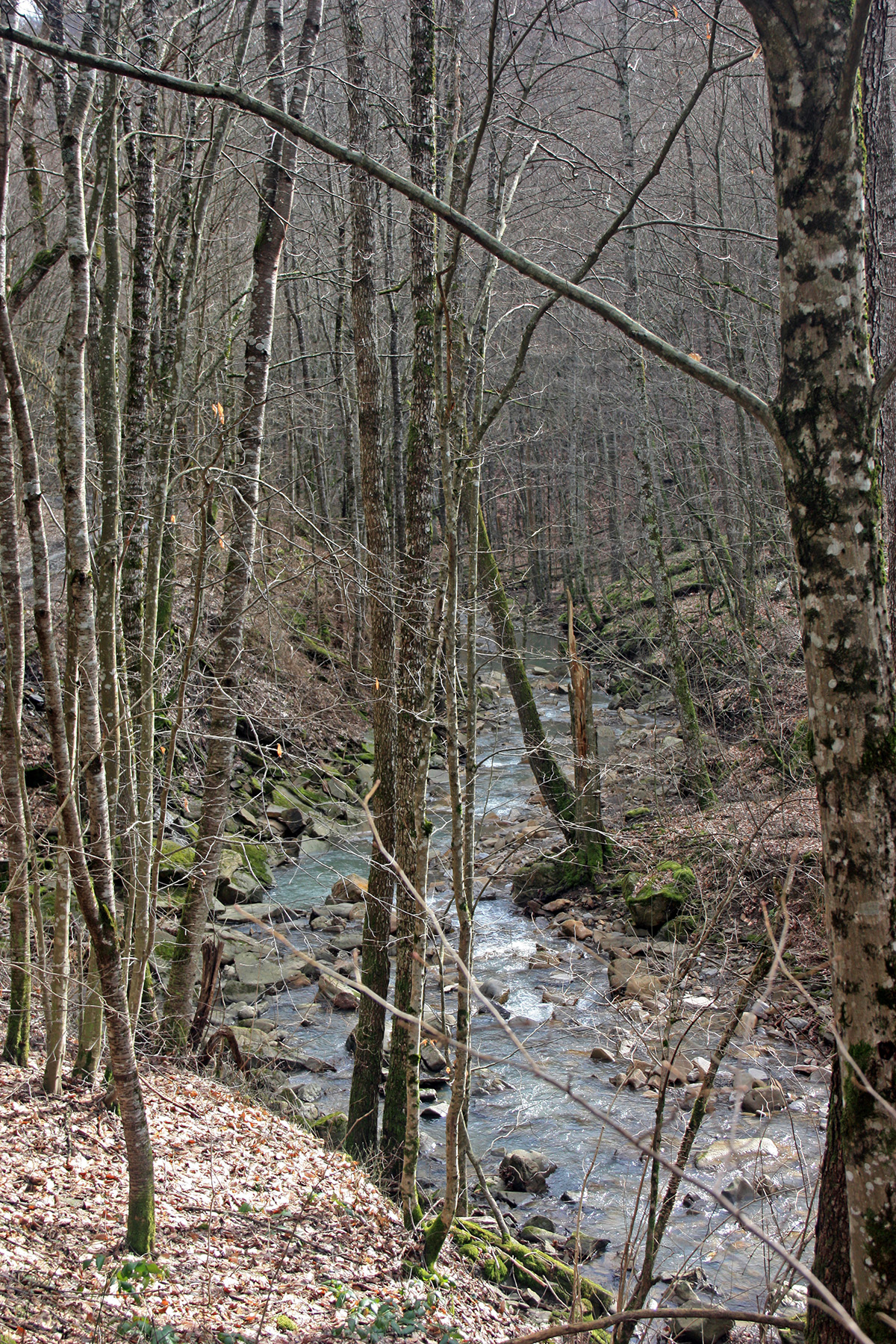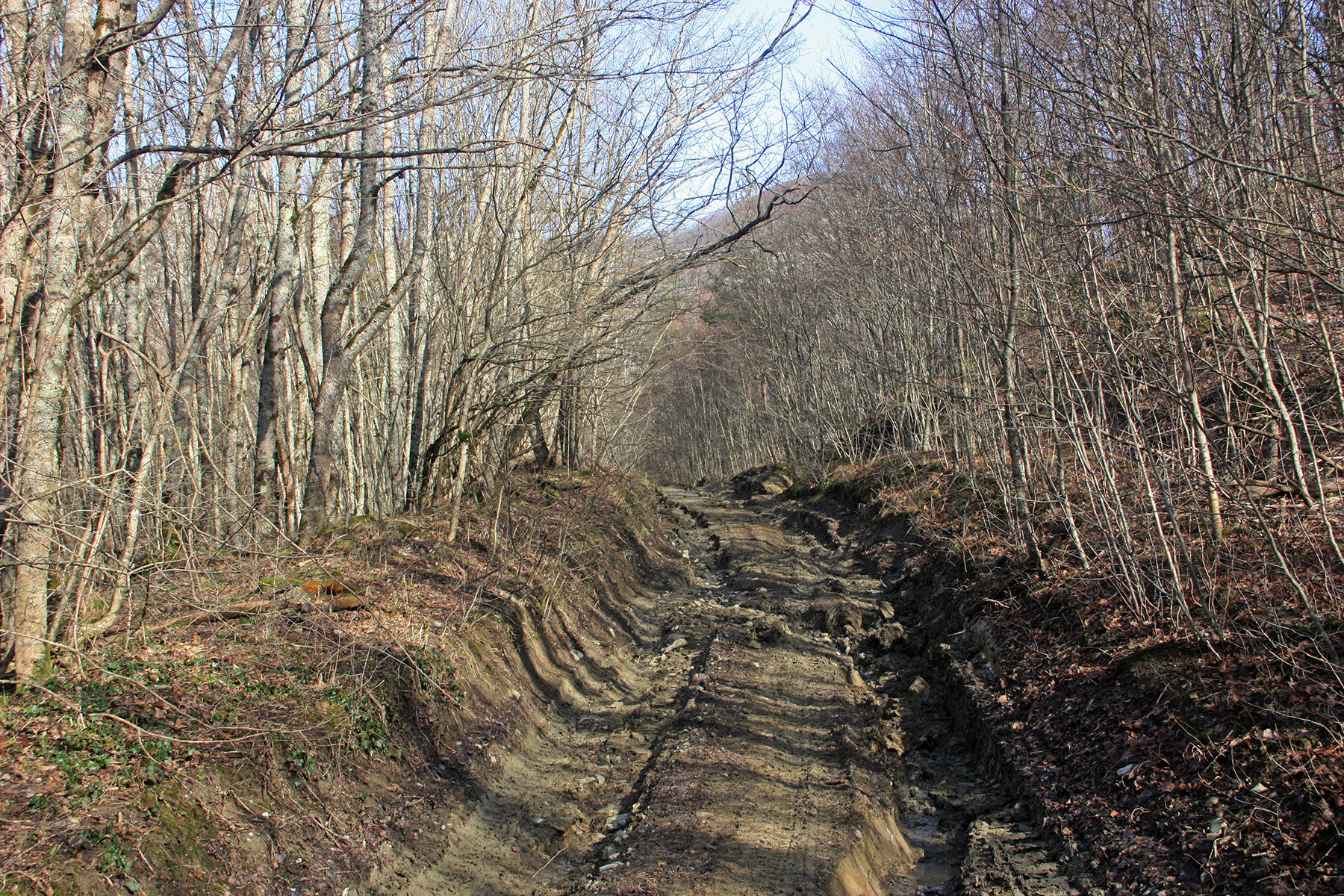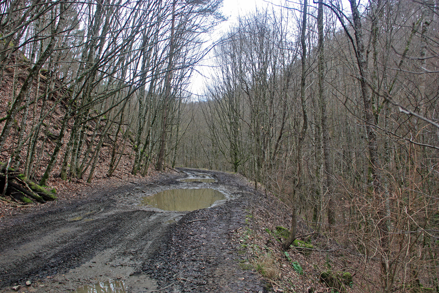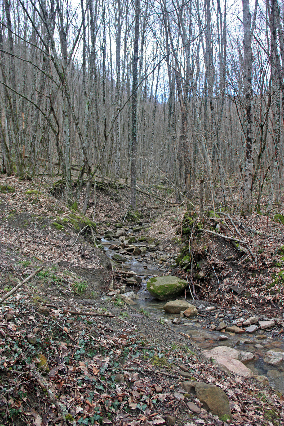 К 16-35 спускаемся по лесистым склонам к ручью. Здесь не один ручей, здесь место, где сходятся несколько русел-оврагов. Некоторые пустые, один-основной, к нему есть притоки. Всё сходится к большому водопропускнику, в виде бетонной трубы, под насыпную дамбу старого волока. Дамба уходит на запад, вверх, на склон. Дальше, по карте, до мест, пригодных под стоянку-далеко. А время-через час начнёт темнеть. Мы пошли в феврале! Ищем пригодное место под стоянку. Нашли, терраска небольшая, но травянистая. Есть место под палатку, удобное место под костёр. Много дров вокруг. Вода рядом, в ручье.
