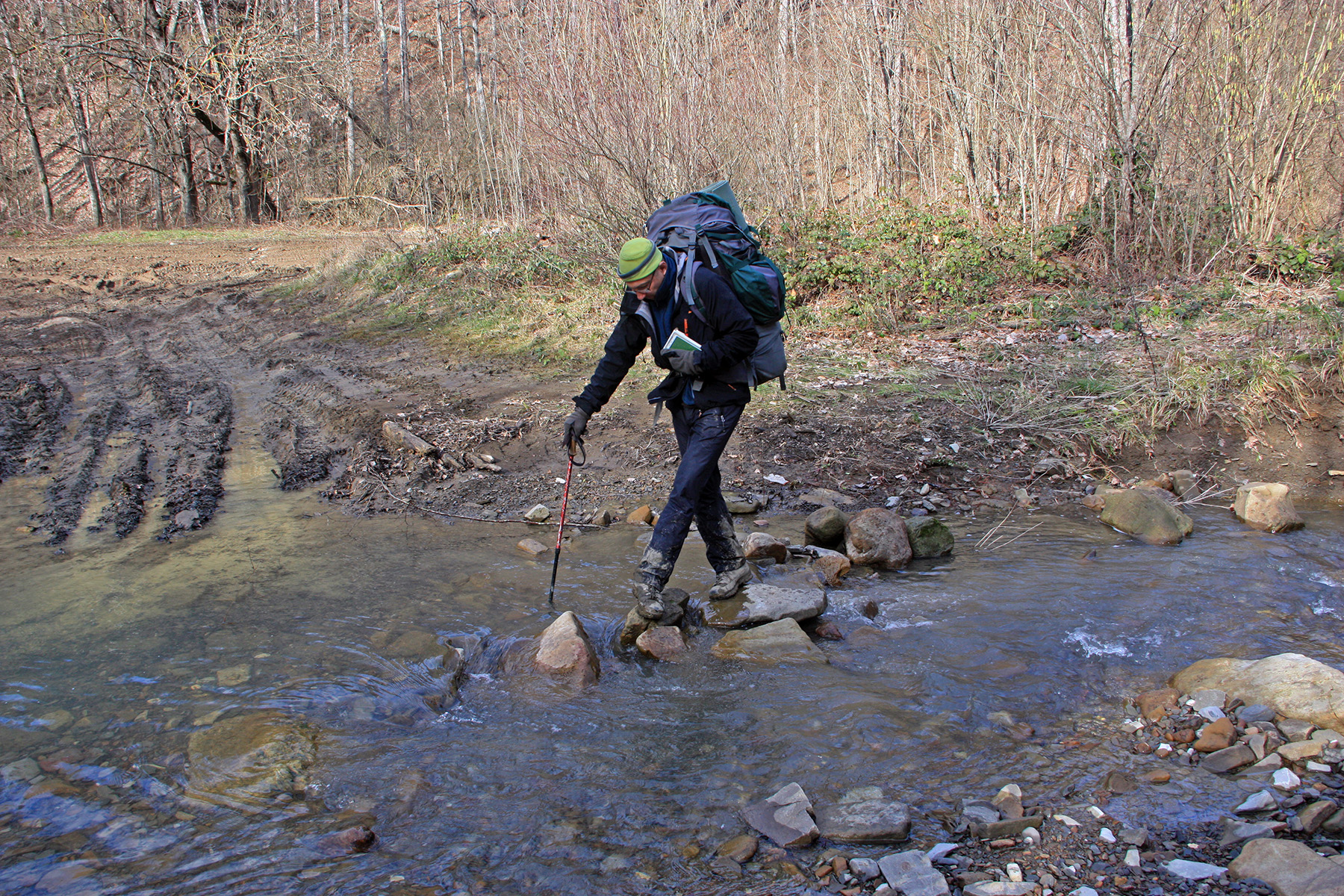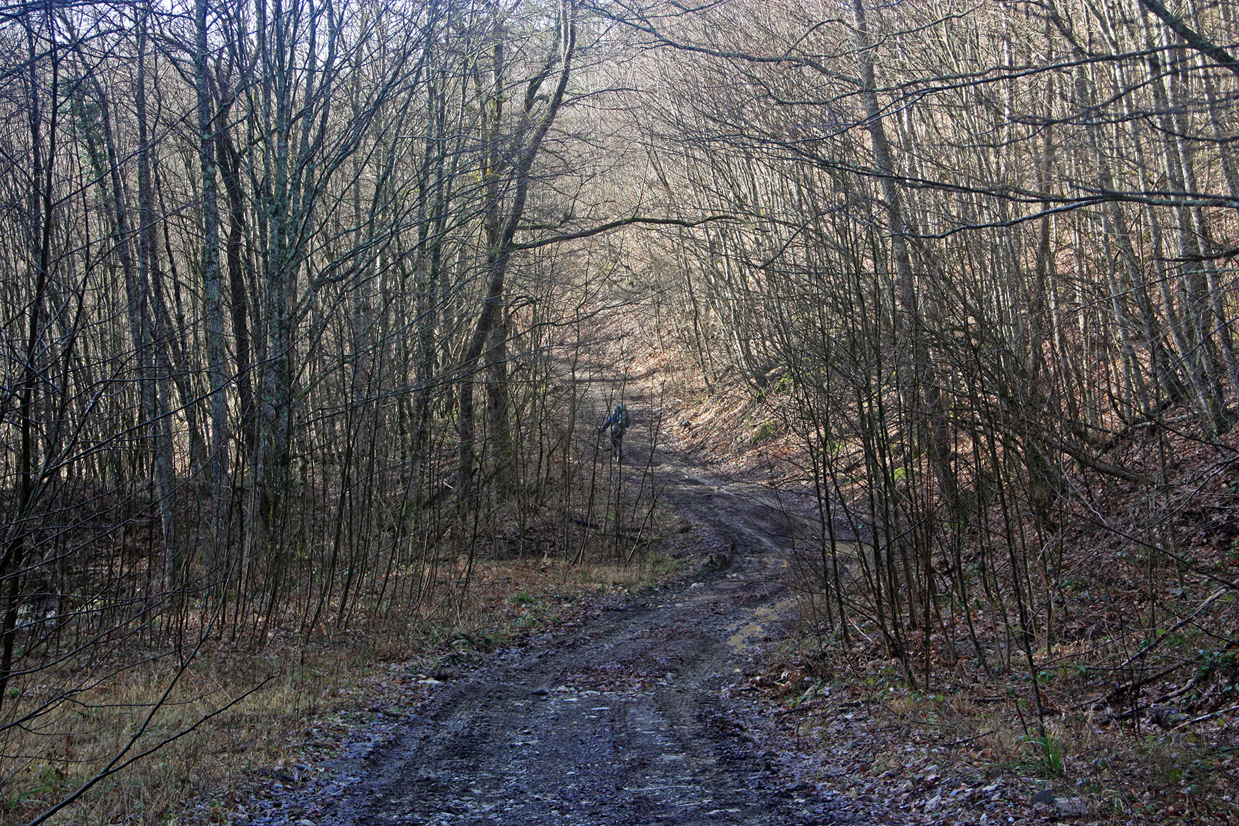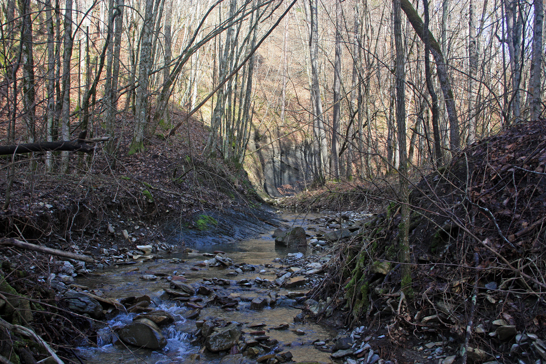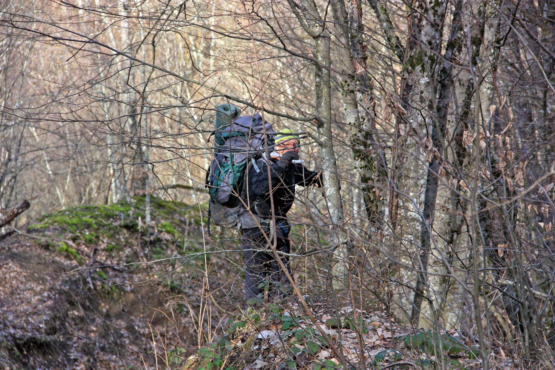 К 16-35 спускаемся по лесистым склонам к ручью. Здесь не один ручей, здесь место, где сходятся несколько русел-оврагов. Некоторые пустые, один-основной, к нему есть притоки. Всё сходится к большому водопропускнику, в виде бетонной трубы, под насыпную дамбу старого волока. Дамба уходит на запад, вверх, на склон. Дальше, по карте, до мест, пригодных под стоянку-далеко. А время-через час начнёт темнеть. Мы пошли в феврале! Ищем пригодное место под стоянку. Нашли, терраска небольшая, но травянистая. Есть место под палатку, удобное место под костёр. Много дров вокруг. Вода рядом, в ручье.