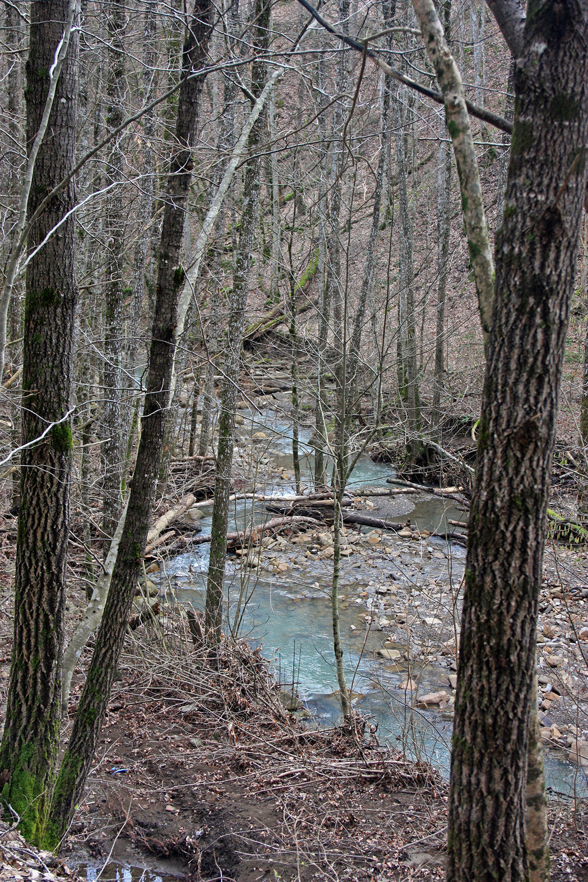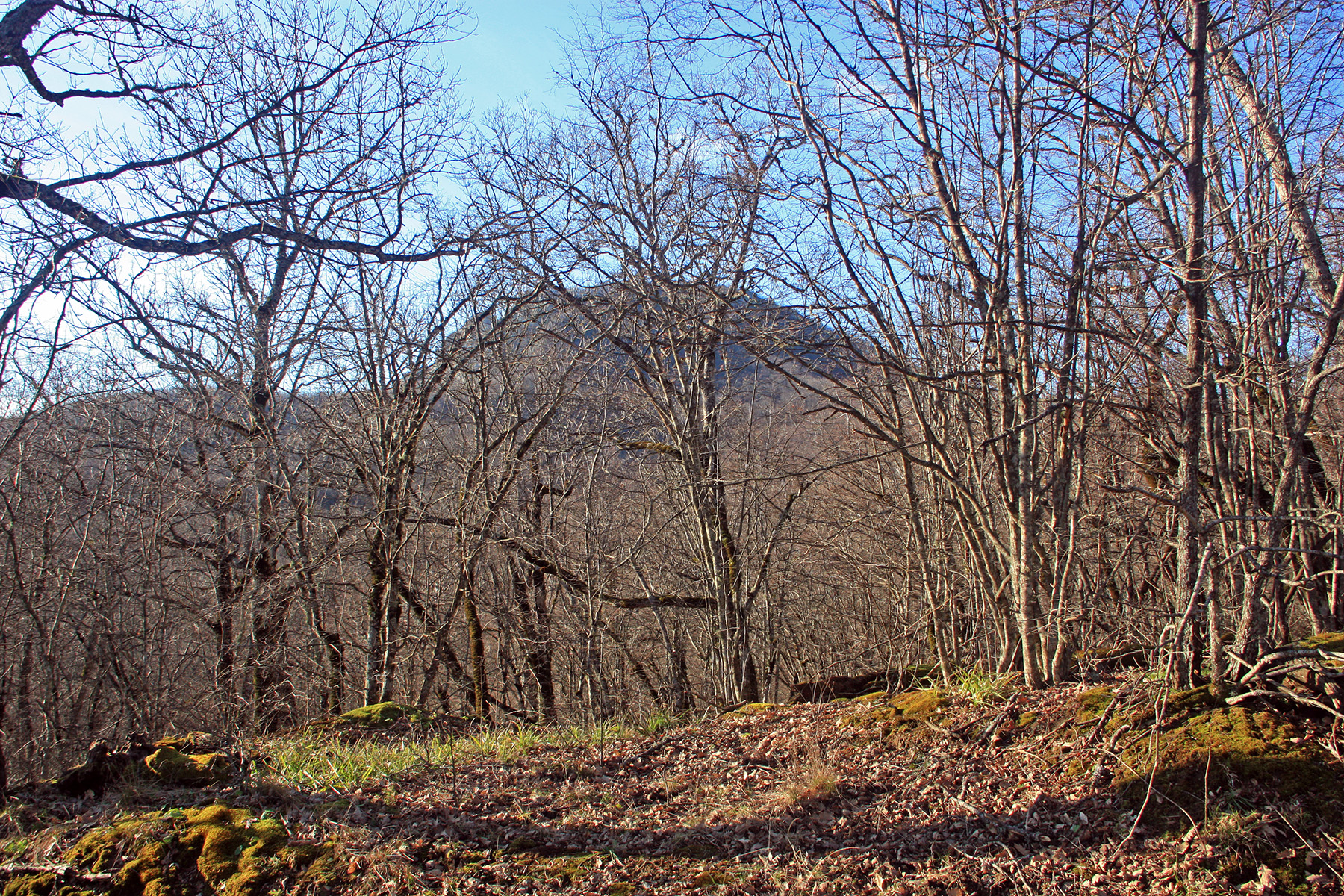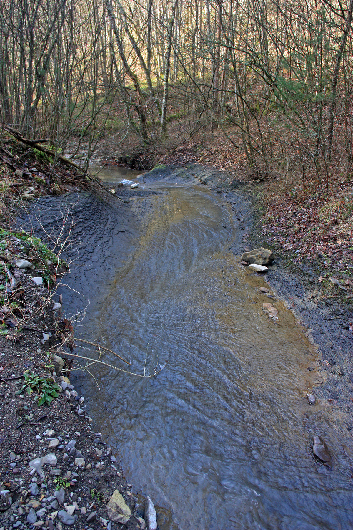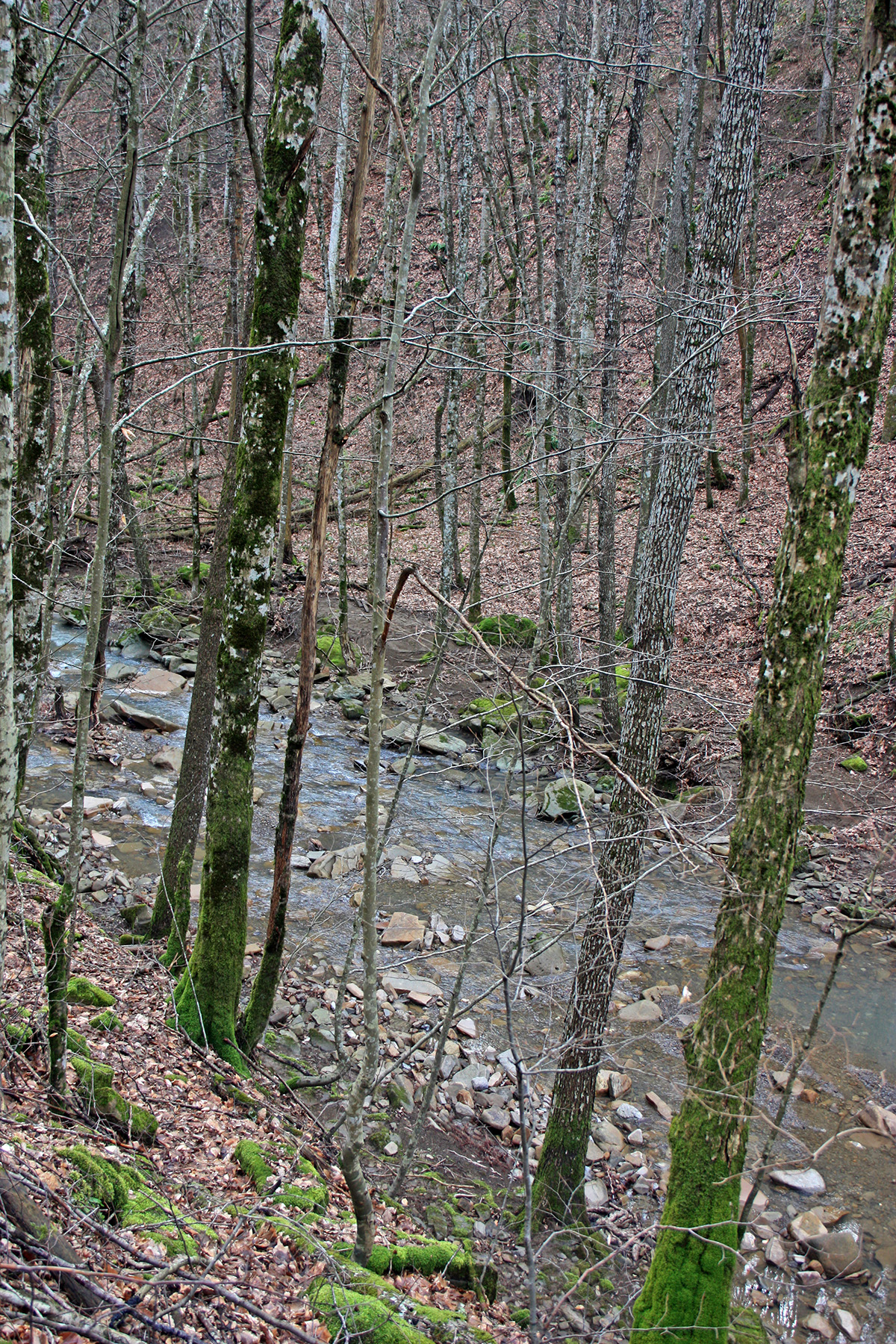 К 16-35 спускаемся по лесистым склонам к ручью. Здесь не один ручей, здесь место, где сходятся несколько русел-оврагов. Некоторые пустые, один-основной, к нему есть притоки. Всё сходится к большому водопропускнику, в виде бетонной трубы, под насыпную дамбу старого волока. Дамба уходит на запад, вверх, на склон. Дальше, по карте, до мест, пригодных под стоянку-далеко. А время-через час начнёт темнеть. Мы пошли в феврале! Ищем пригодное место под стоянку. Нашли, терраска небольшая, но травянистая. Есть место под палатку, удобное место под костёр. Много дров вокруг. Вода рядом, в ручье.