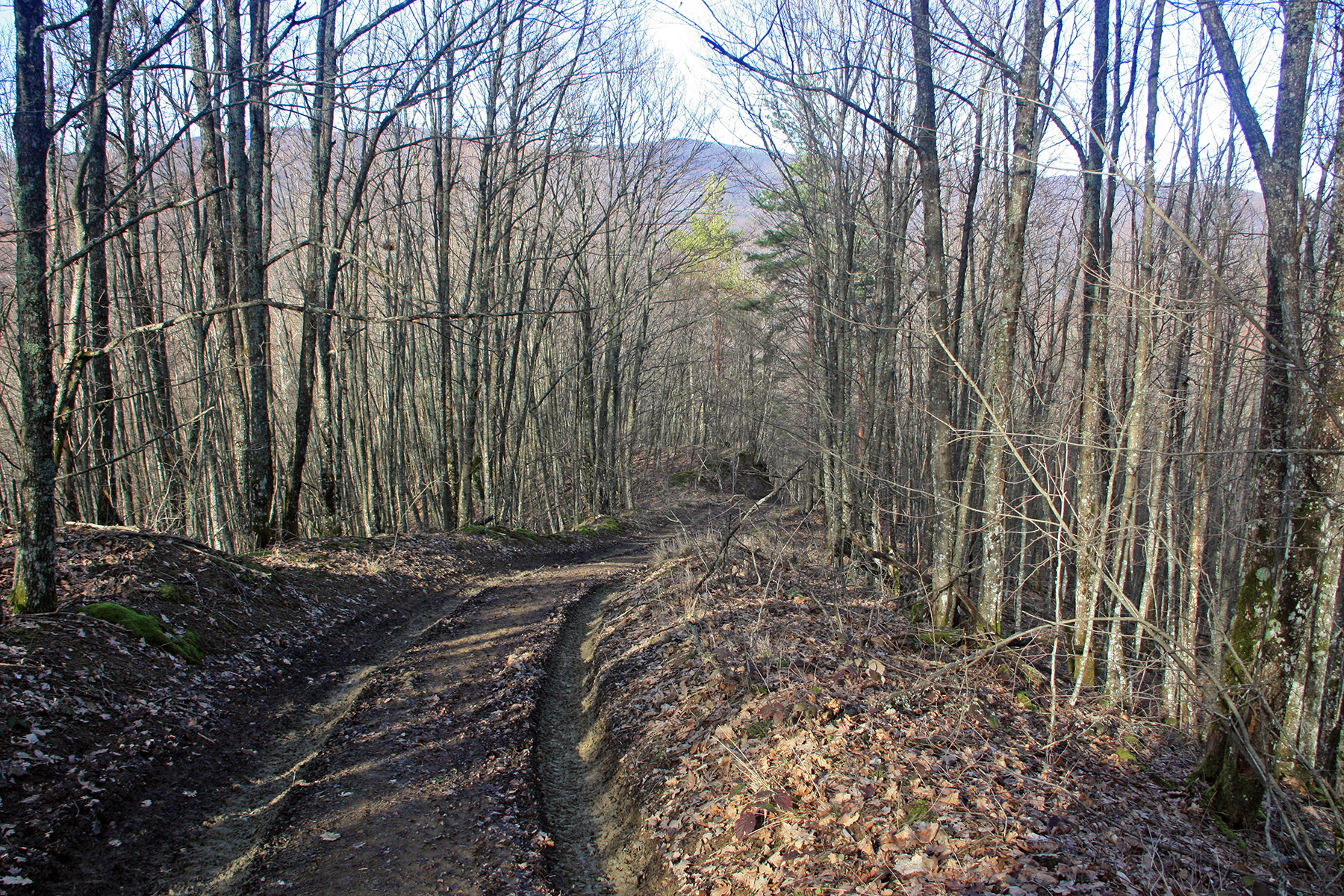 Наша дорога постепенно уходит вправо, на склон. С наезженной дороги нам надо переползти на соседнюю, плохонькую, ниже по склону. Здесь когда-то проводили лесозаготовки, и этих волоков набили много. За прошедшее время вырос новый лес, и их теперь трудно найти. Своеобразный лабиринт на лесистых склонах.