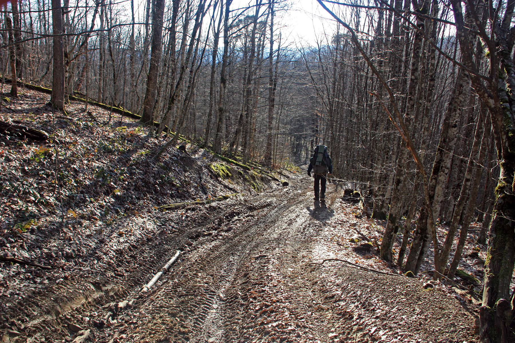 Метров 100 шли по склону, над волоком. Здесь не было кустарника, деревья обходились легко. Потом волок стал «чистым», и мы вышли на него. Идём вверх, в гору. Через 10 минут вышли на «перевал», достигли гребня, и перевалили на другую сторону. Начался спуск. Волок давно не езженный, для пешеходов чистый, приятный. В 10-50 вышли к грязному «работающему» волоку. Здесь нам влево, на юг. По волоку. За спиной-стена восточного Папая.