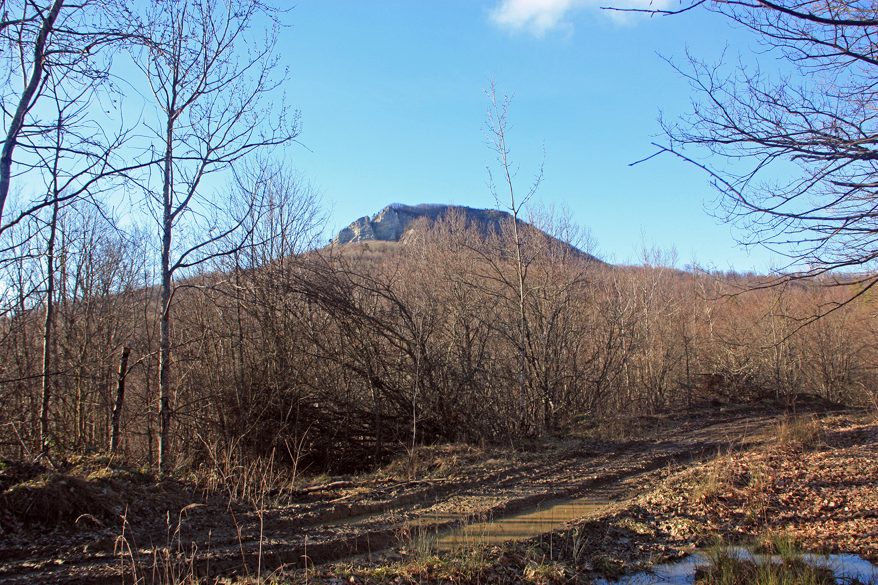 В 15-45 пересекаем ручей в скальном ложе. Через 5 минут выходим на горизонтальный участок дороги. С неё опять открывается вид на Восточный Папай. Мы на стороже, вот-вот должен быть поворот вниз и вправо. Но всё же пропускаем его. Проходим вперёд метров 100. Однако Паша «на стрёме» со своим навигатором. Останавливает, и возвращаемся назад. Поворот оказался за валом гребня, и при движении сверху-вниз (по дороге) он выпадает из поля зрения. Вдобавок, вся обочина в равномерных зарослях высохшей травы, кустов, молодой поросли деревьев. Поэтому поворот-«замаскирован».