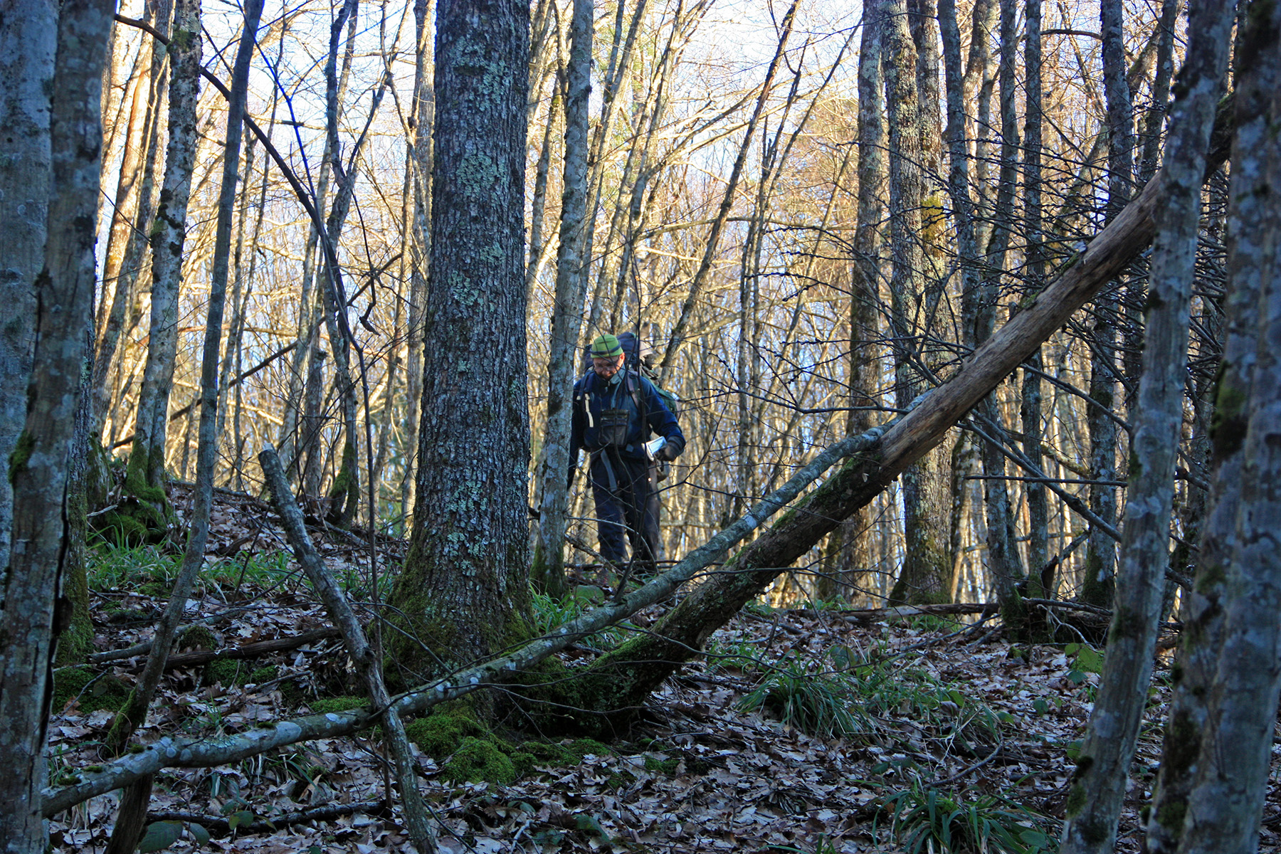 В 16-03 мы на нужном волоке. Вначале-плавный сброс высоты. Далее волок растворяется на поляне с молодыми деревьями. Похоже-старая вырубка. Дальше идём визуально, ориентируясь «на глазок». Паша говорит, что должен быть ручей. Надо спуститься к нему. На его берегах возможна ночёвка. Постепенно мы оказываемся на широком гребне, уходящем вниз. Справа обозначилось сухое русло, которое чем дальше-тем глубже. Слева склон «загибается» вниз с большей крутизной, и простираясь далеко вниз, теряется в лесу.