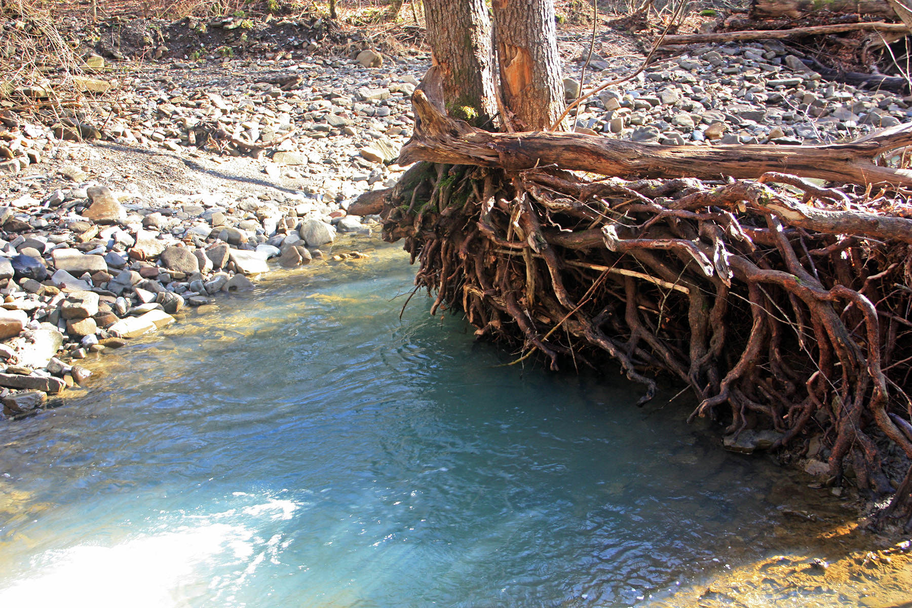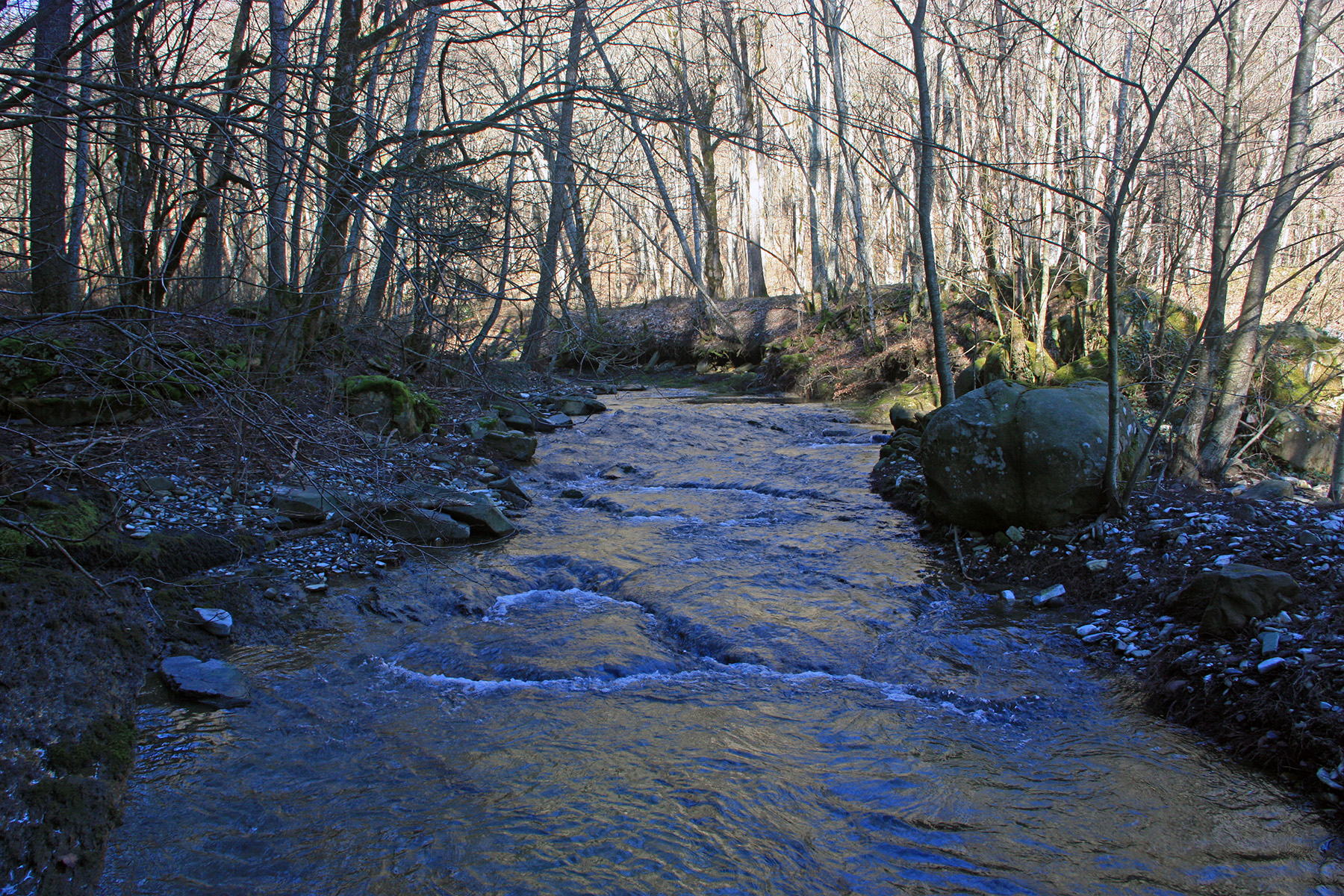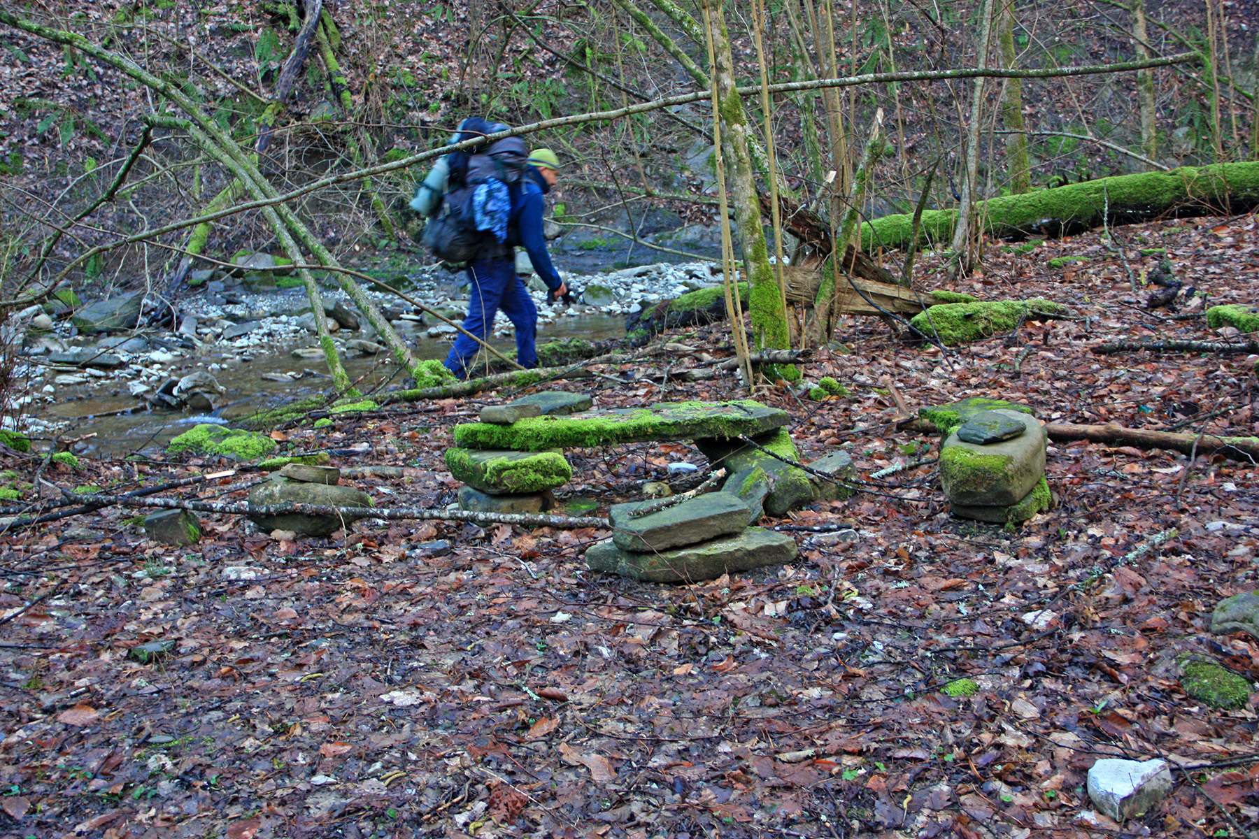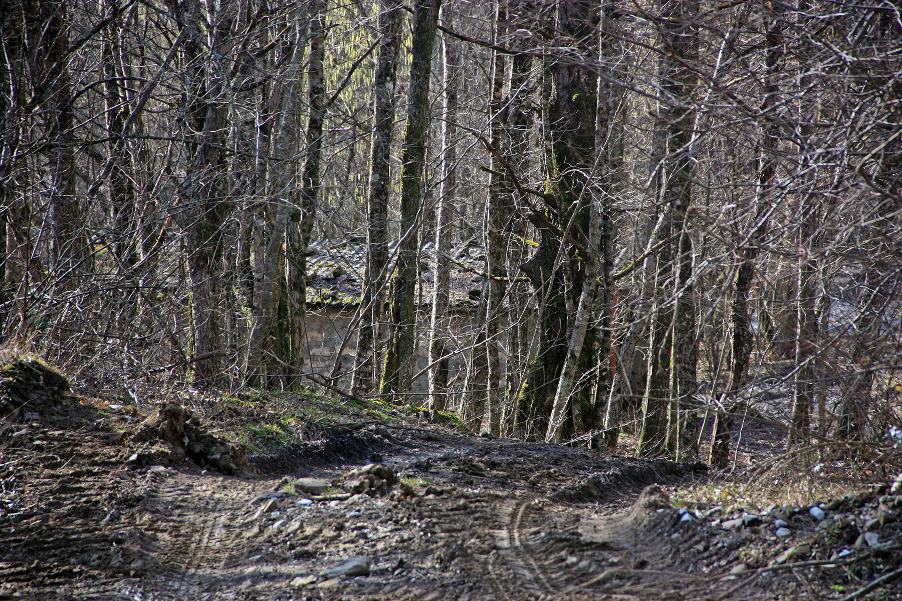 Далее-гряземес, не такой глубокий, как вдоль Убинки, но достаточный, чтоб испортить весеннее настроение. В 12-16 выходим к «Чёрному аулу». Видим остатки одного строения. Через пару минут стоим на слиянии 3-х истоков реки Чёрная.