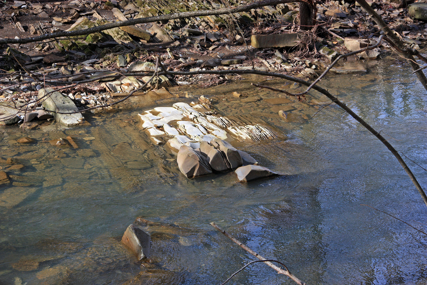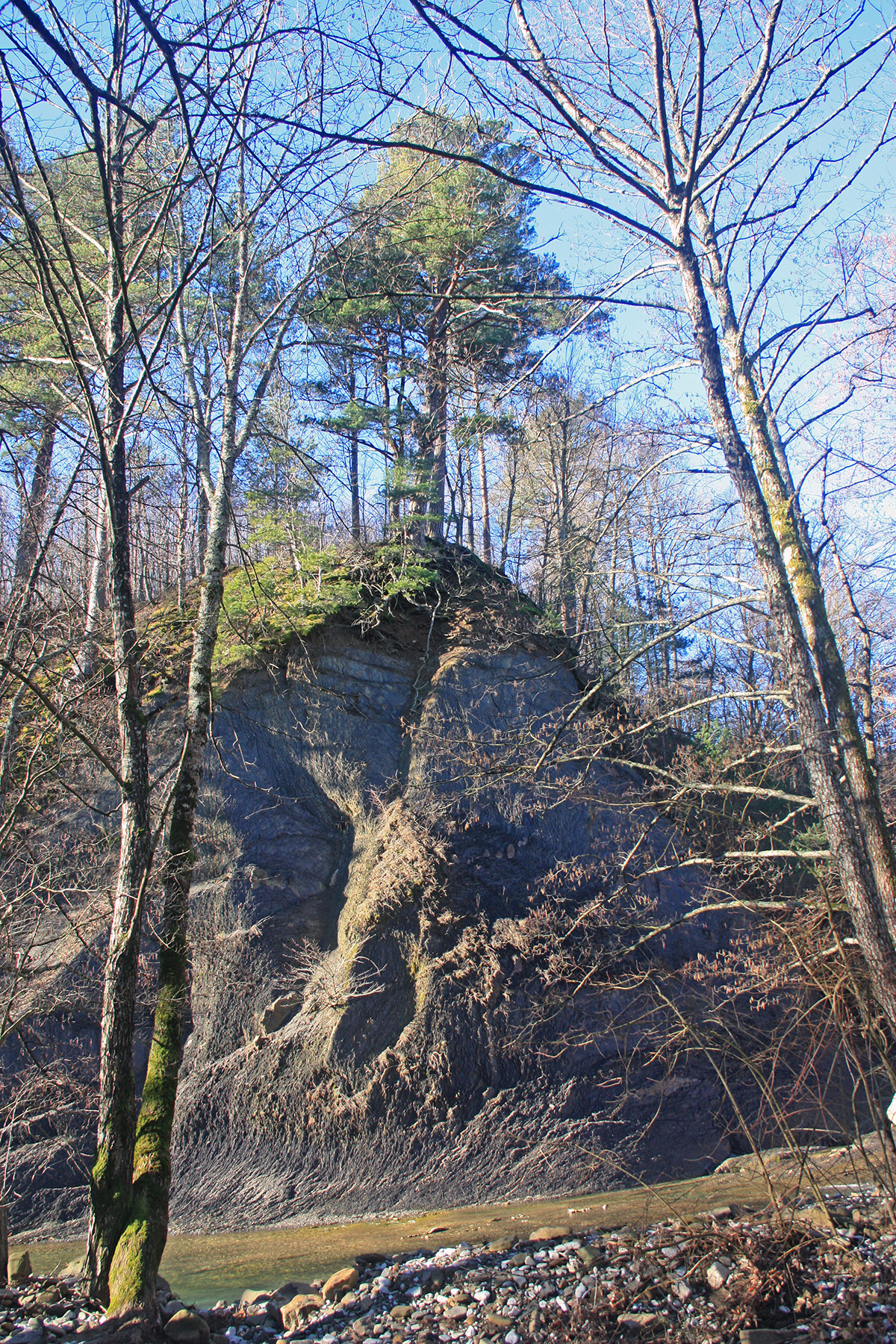 В 12-56 по укатанной дороге, проходим скальную стенку над руслом реки. Паша говорит, что здесь раньше брали «платсушку» на местное строительство.