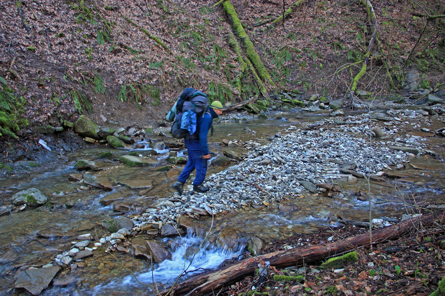 Паша забыл, где надо сойти с тропы, и пройти под первый водопад в Мельничном. А когда мы его заметили, были уже сверху. Откуда не спуститься. Пришлось пройти мимо.