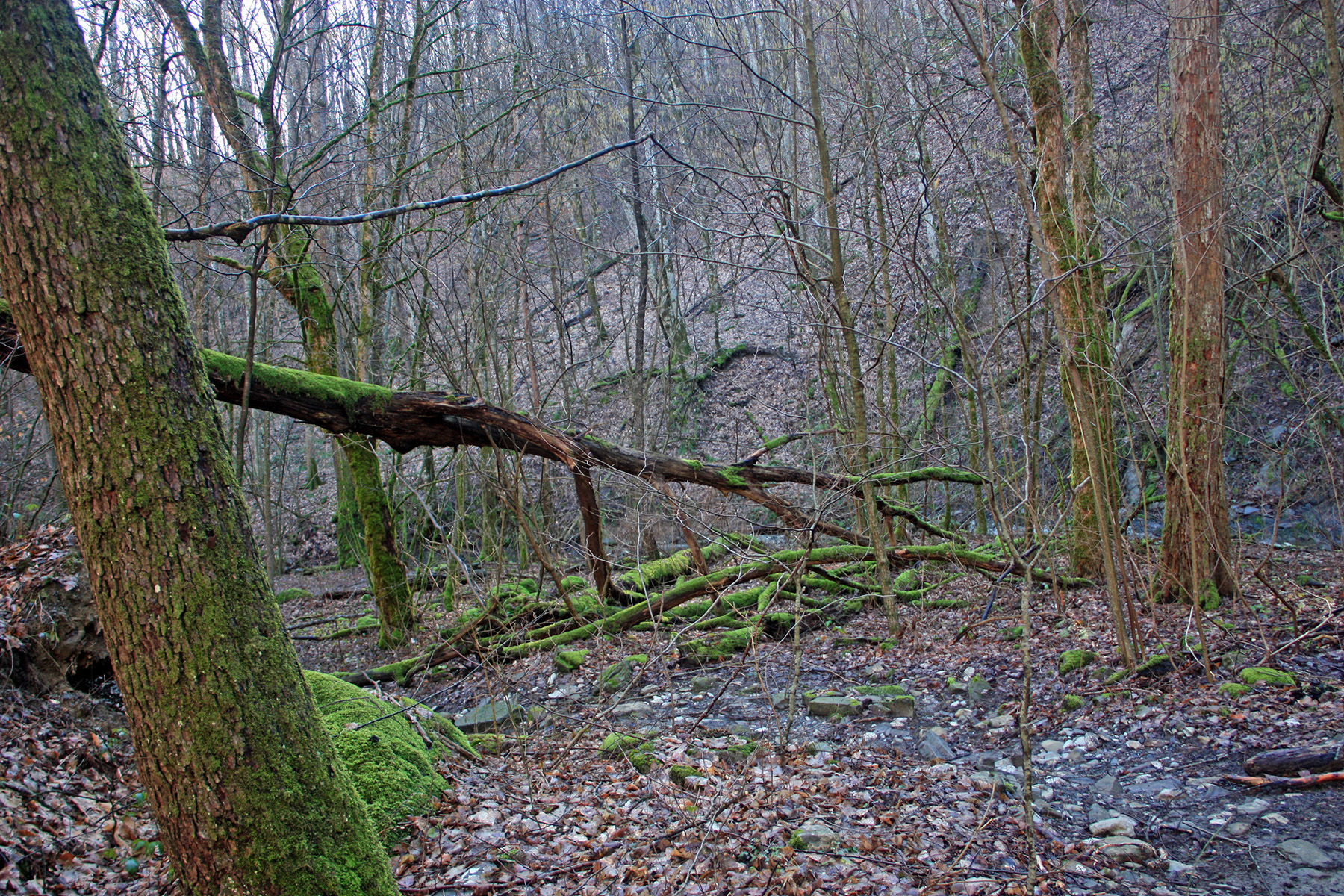 Далее русло уходит в небольшой каньон. Полезли на склон, на склон левого борта ущелья. А здесь другой волок! И Паша про него знает. Он всё здесь знает, это его любимый район. Время 11-58.