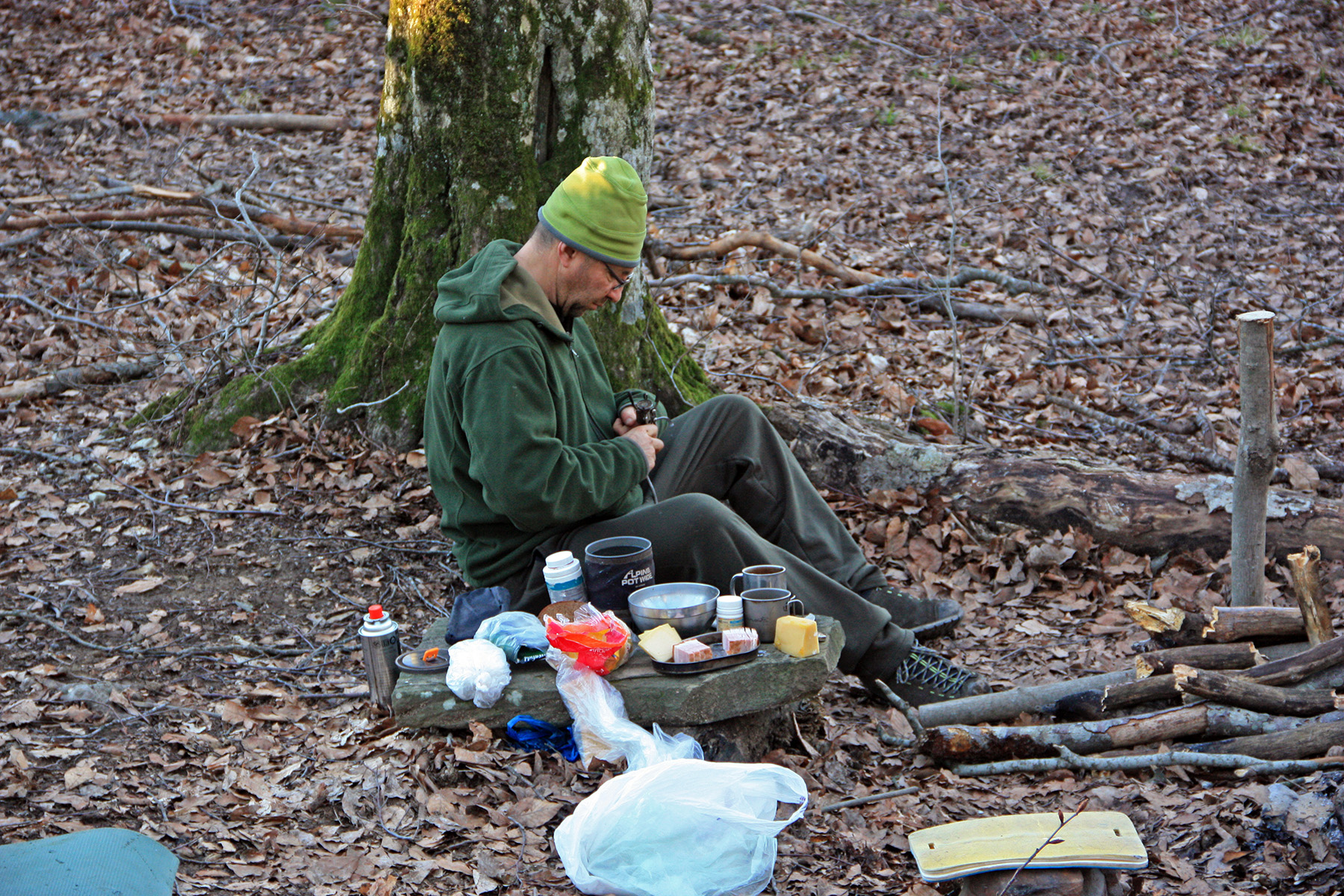 В начале второго становимся на обед. На небольшом горизонтальном участке гребня. Воды мало. Принёс всего литровую бутылку воды. У Паши вообще бутылки нет. Терпим, и кипятим чай. Газа хватает. Пока. А впереди ещё ночёвка, и возможно, ещё один обед.