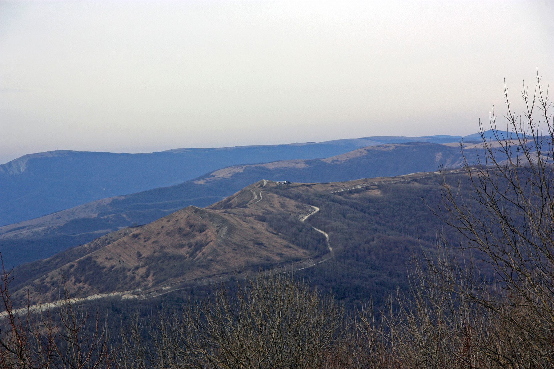 ...гора Шахан. Там, где дорога поворачивает, и над поворотом видно строение. Высота 704 м.