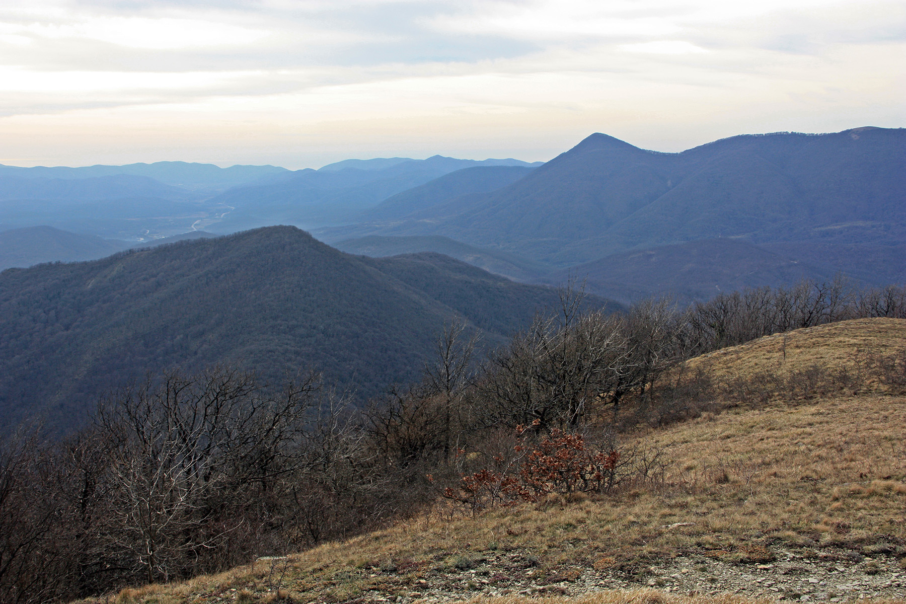 Прогалины чередуются с зарослями кустарников, с лесом. На небо постепенно натягивает «чехол». Видно море.