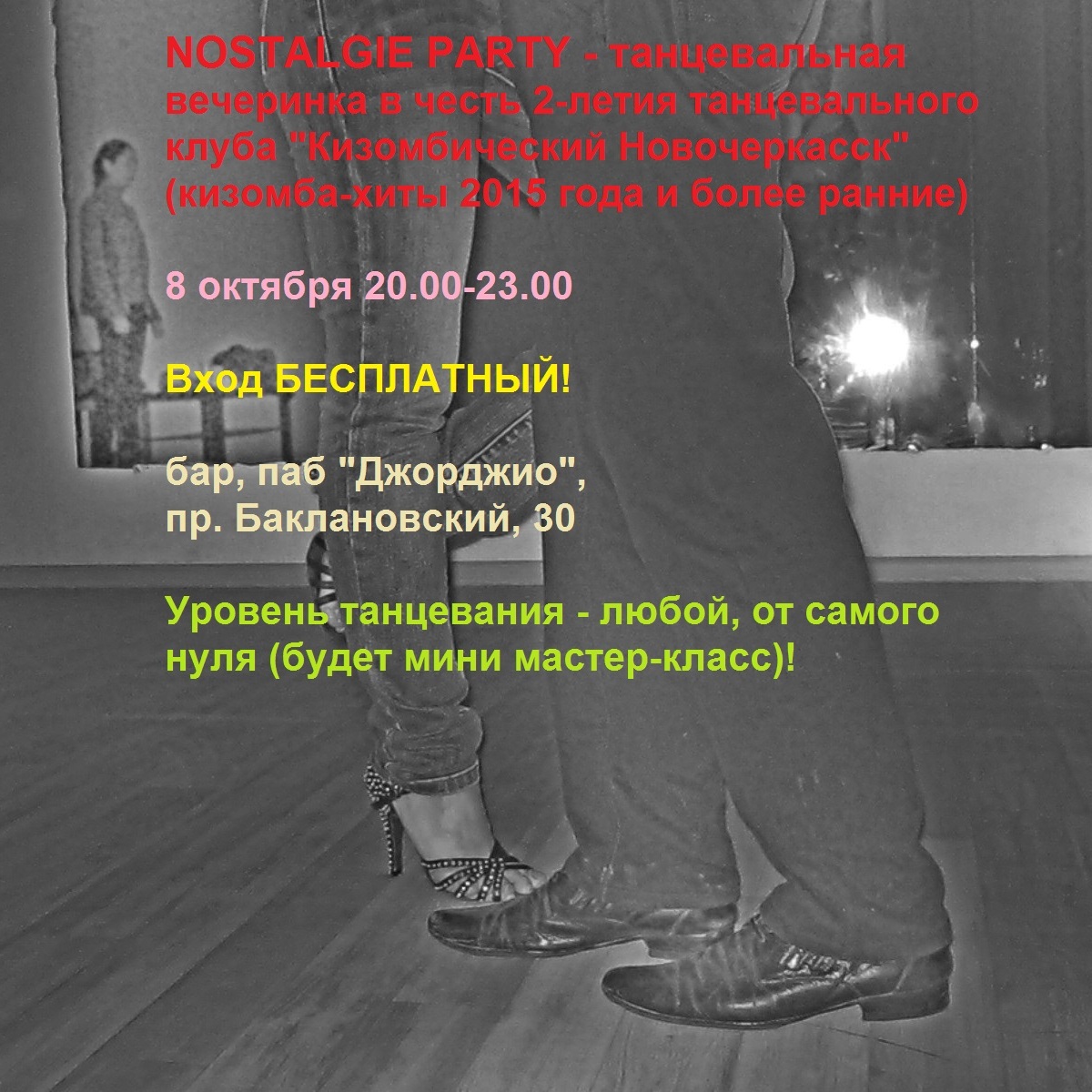 Формат "Ностальжи-пати"! Абсолютно все треки будут не позже 2015 года выпуска! Только старые кизомба-хиты! На кого-то нахлынут приятные воспоминания о протанцованных когда-то кайфовых танцах, первых кизомба-занятиях и вечеринках, а кто-то впервые окунется в неизведанную, но такую волшебную атмосферу.