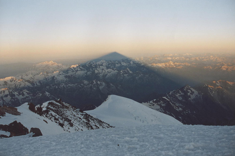 Мне кажется, что снято из р-на пер. Хотютау. Рассвет, объектив на запад. За гребнем на переднем плане-ущ. Уллу-кам. Левая граница тени проходит по вершине Фильтр, чуть выше и правее её-в. Гвандра (снежный конус). Под вершиной теневого конуса (2 см. ниже)-в. Чат, левее её-массив Доломиты... и т.д. и т.п.