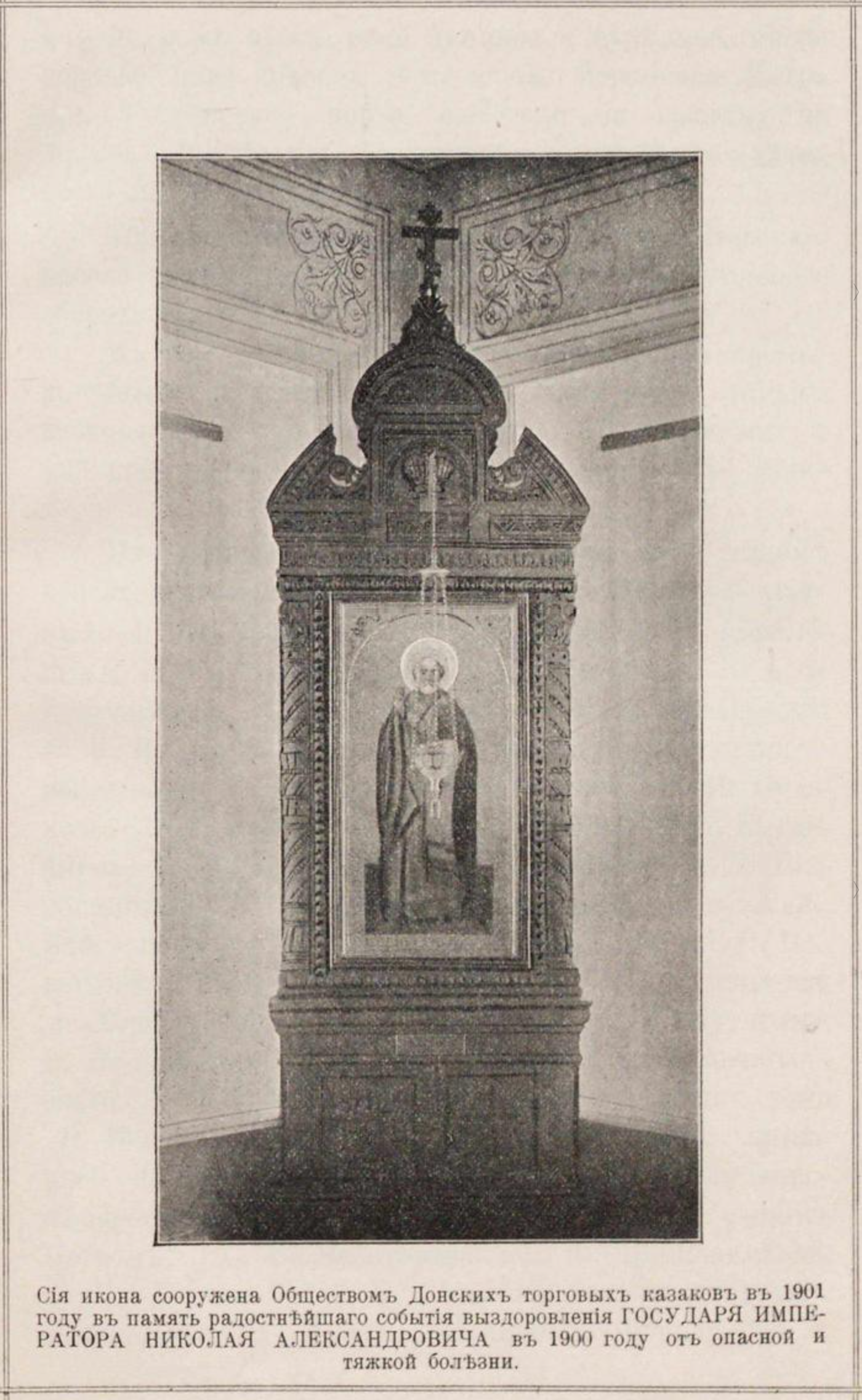 Икона (фото 3), сооружённая Обществом Донских торговых казаков в 1901 в память выздоровления Николая II в 1900 году от опасной и тяжкой болезни.