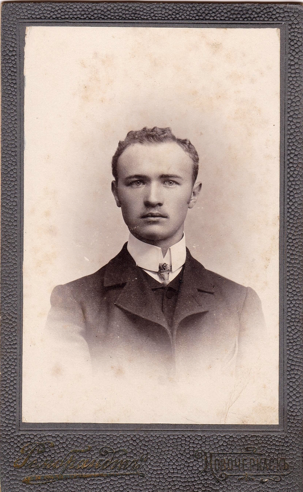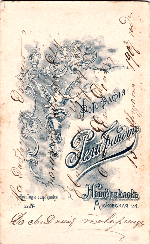 Ну а судя по штампу, портретируемый снят в фотоателье Качинского (Новочеркасск, ул. Московская, дом 22) в марте 1900 года