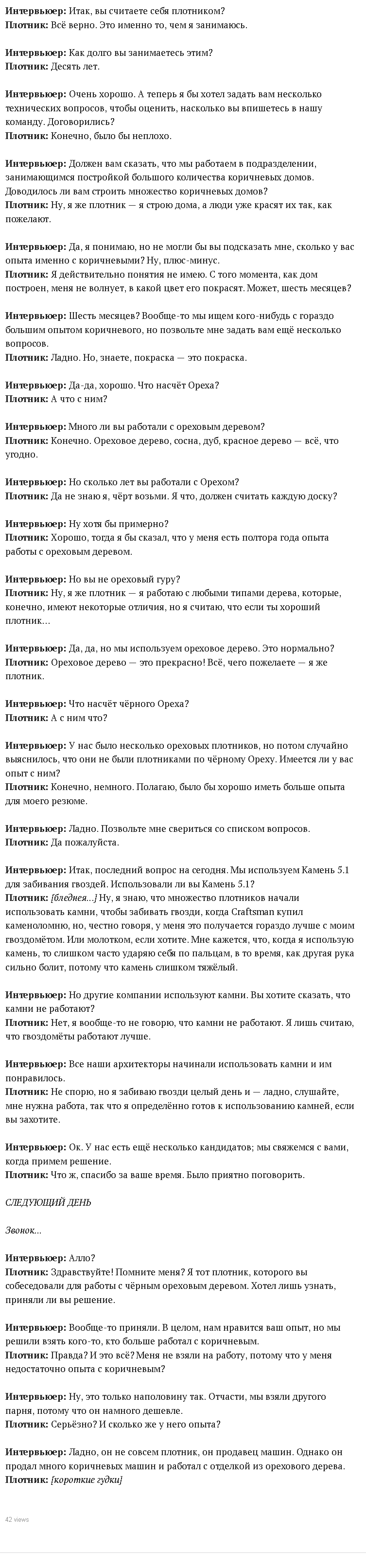 Специально для Ливадика: в некоторой степени согласен с Вами, нормальный работник, как правило, имеет работу, поэтому приходится порой перекапывать тонны, чтобы достать что-то дельное. Но и с другой стороны посмотрите на ситуацию: РД берет на работу, по большому счету, функцию, не человека. Но при этом РД важно потешить свое мелкое самолюбие....
