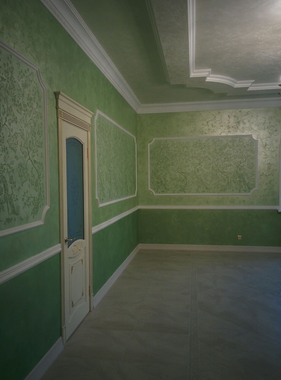 1) нанесение декоративных покрытий (травертин, туф, бетон, венецианская штукатурка, шелк, бархат и т.д.), декорирование лепнины, каминных порталов, мебели