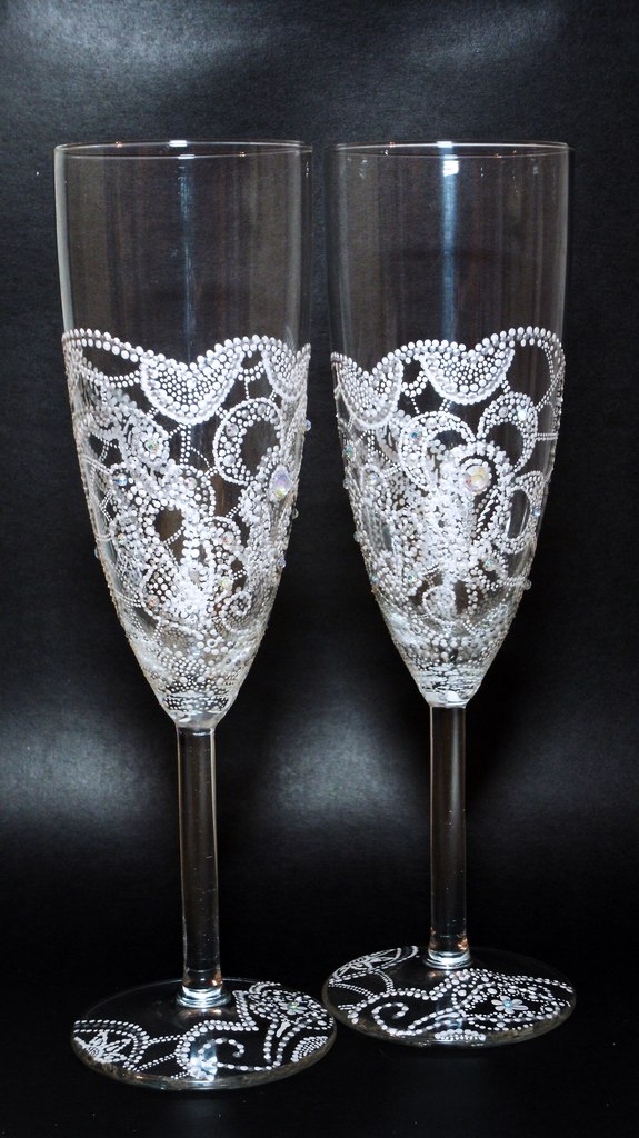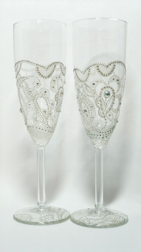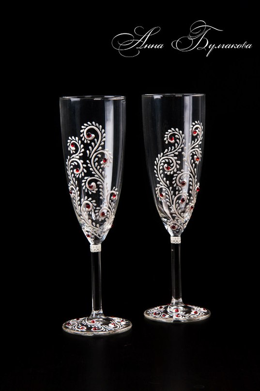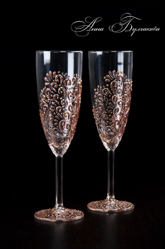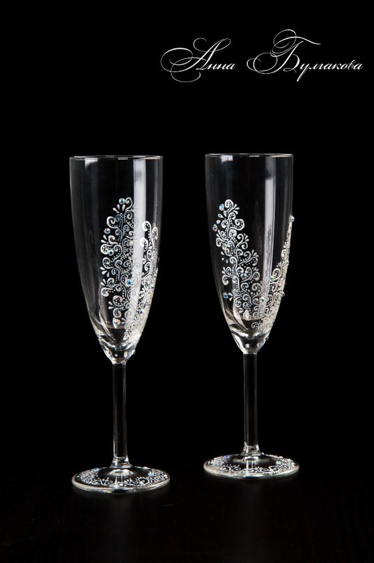 Бокалы - французское стекло, ручная кружевная роспись, кристаллы. Заколка-автомат - японская полимерная глина.