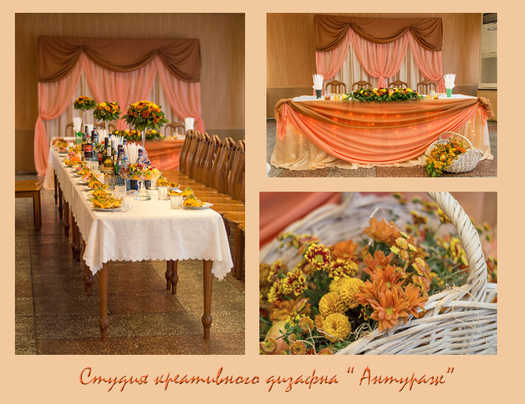 - оформление банкетного зала ( стол молодоженов, гостевые столы, фотозоны и т.д.)