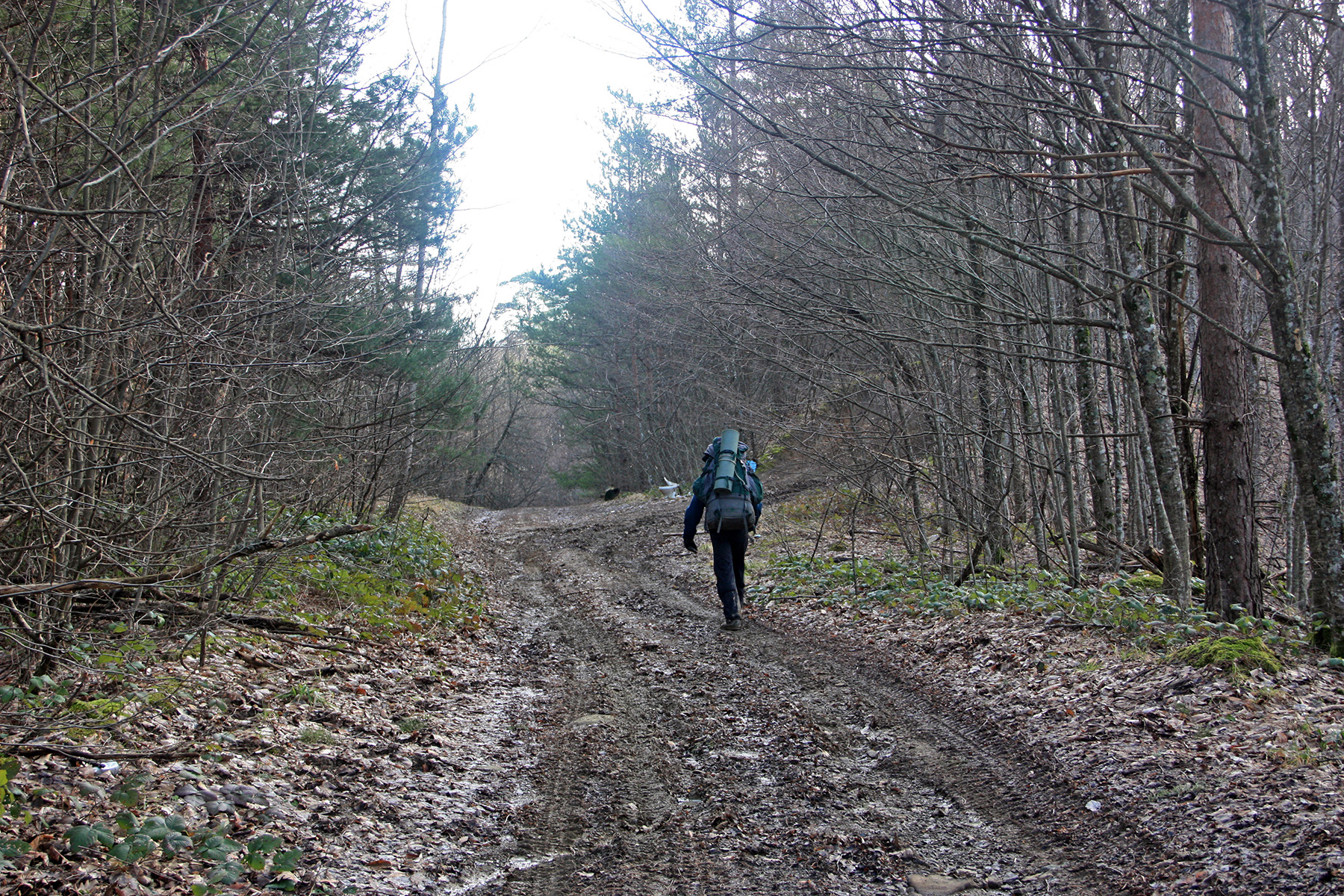 Метров 100 шли по склону, над волоком. Здесь не было кустарника, деревья обходились легко. Потом волок стал «чистым», и мы вышли на него. Идём вверх, в гору. Через 10 минут вышли на «перевал», достигли гребня, и перевалили на другую сторону. Начался спуск. Волок давно не езженный, для пешеходов чистый, приятный. В 10-50 вышли к грязному «работающему» волоку. Здесь нам влево, на юг. По волоку. За спиной-стена восточного Папая.