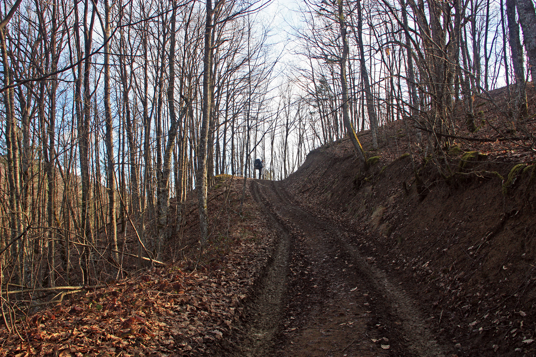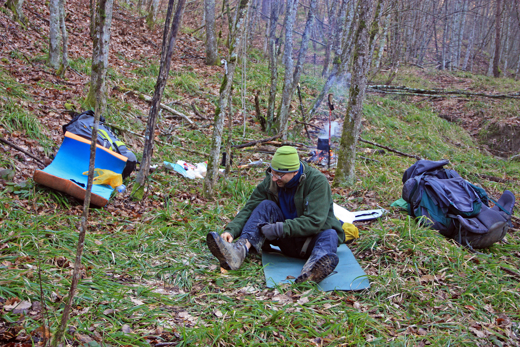 К 16-35 спускаемся по лесистым склонам к ручью. Здесь не один ручей, здесь место, где сходятся несколько русел-оврагов. Некоторые пустые, один-основной, к нему есть притоки. Всё сходится к большому водопропускнику, в виде бетонной трубы, под насыпную дамбу старого волока. Дамба уходит на запад, вверх, на склон. Дальше, по карте, до мест, пригодных под стоянку-далеко. А время-через час начнёт темнеть. Мы пошли в феврале! Ищем пригодное место под стоянку. Нашли, терраска небольшая, но травянистая. Есть место под палатку, удобное место под костёр. Много дров вокруг. Вода рядом, в ручье.