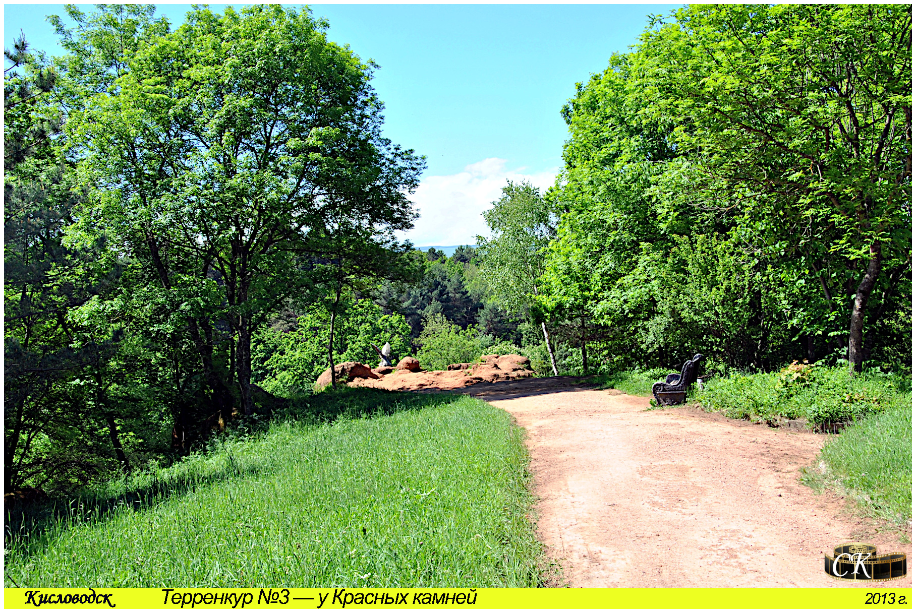 Терренкуров всего — №1, №2,№3, №2Б. Местами они пересекаются или идут вместе. Остальные многочисленные аллеи , тропинки и тропки, как бы вне терренкуров. И как бы совсем отдельная история — г. Малое седло, г. Шульгач, г. Большое седло, Лермонтовская скала, Березовское ущелье, Замок на р. Аликоновка... Практически все давным-давно исхожено. Естественно, со временем происходят те или иные изменения. К примеру, вот это фото было сделано мною во время первого пешеходного похода к Замку в долине реки Аликоновка в далеком 1965 г. В настоящее время территория города в ту сторону расширилась и практически соединилась с поселком Зеленогорский и большую часть пути можно проехать на маршрутке. А в то время (когда делался снимок) — только пешком). Теперь это место изменилось до неузнаваемости. Повторить снимок с той же точки не представляется возможным. Склон горы, с которого был сделан снимок, зарос лесом. Территория вокруг Замка приросла строениями новодела с заборами, новыми кафе и пр. И здесь же торгуют, типа вещевой рынок. Пропала аура одинокого и романтического места... Нынче эти места смотрятся так: ,